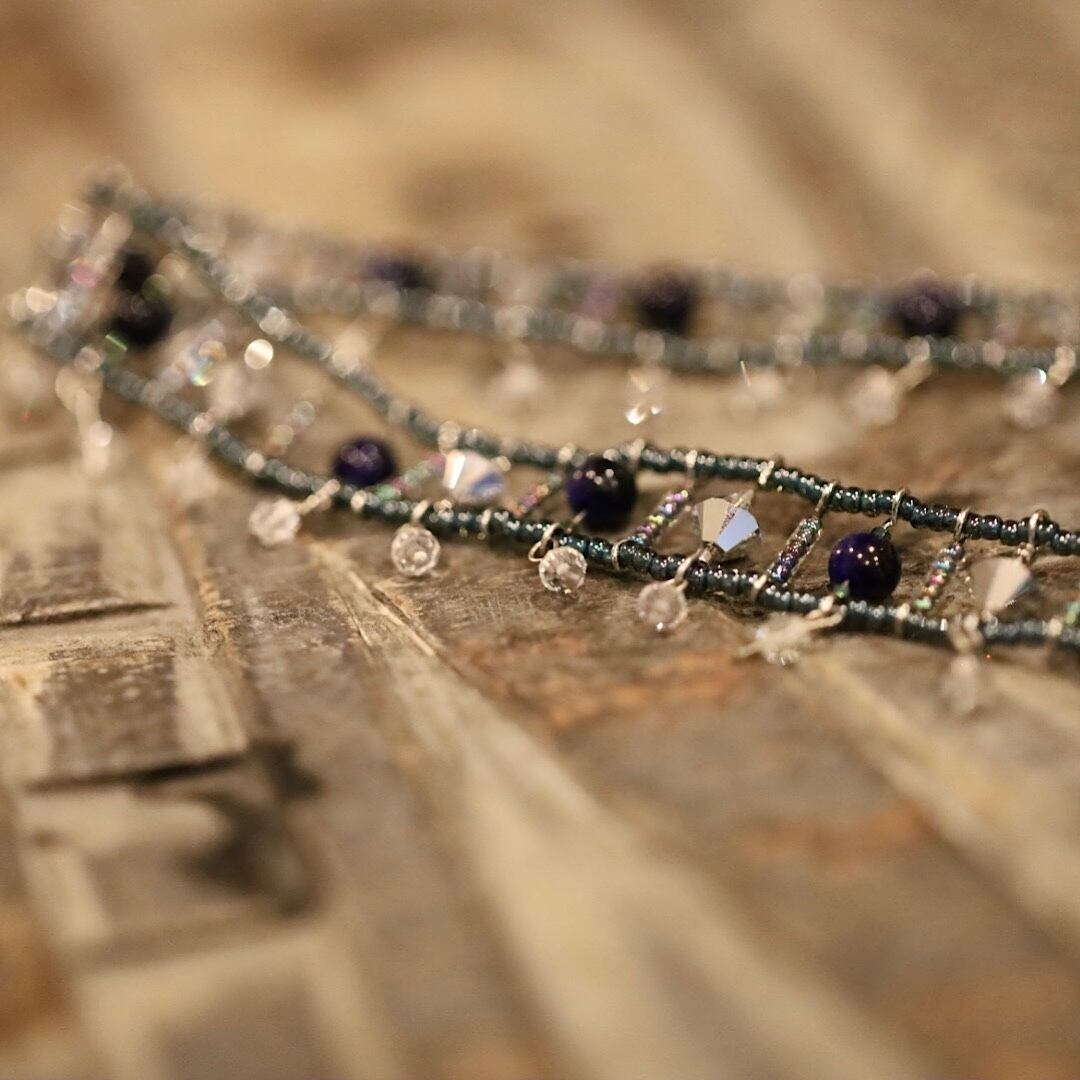 素材:スワロフスキー、天然石(グレイッシュなパープル色の淡水パール)、ガラスビーズ